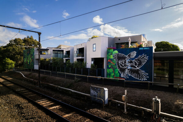 David Lee Pereira and Amina Briggs were all too keen to jump straight on the tools for 2024, tackling two walls along the rail corridor in Ferntree Gully. The two artists collaborated to create a cohesive design that spanned across both walls, and represented themes of environmental consciousness and First Nations heritage.