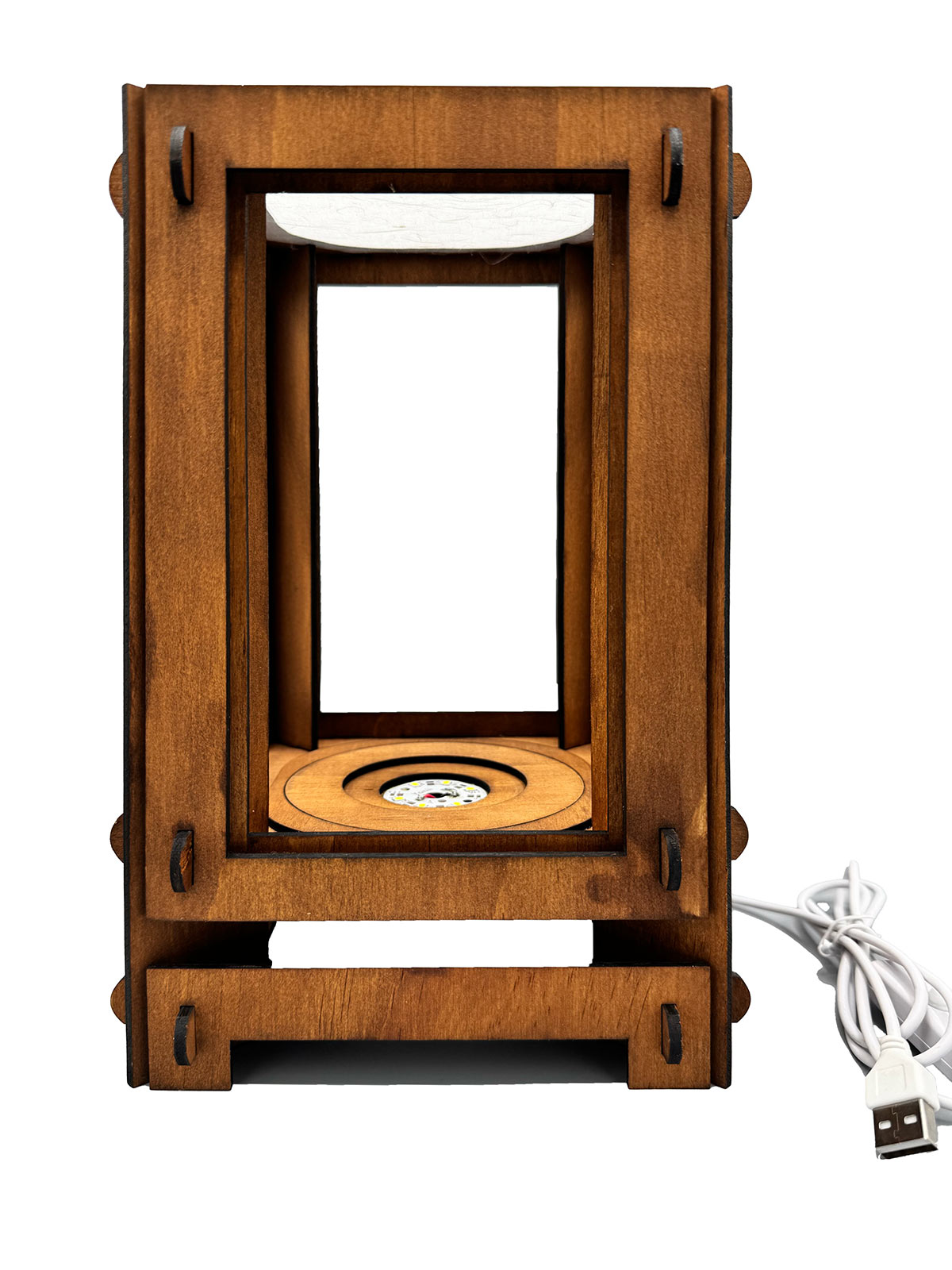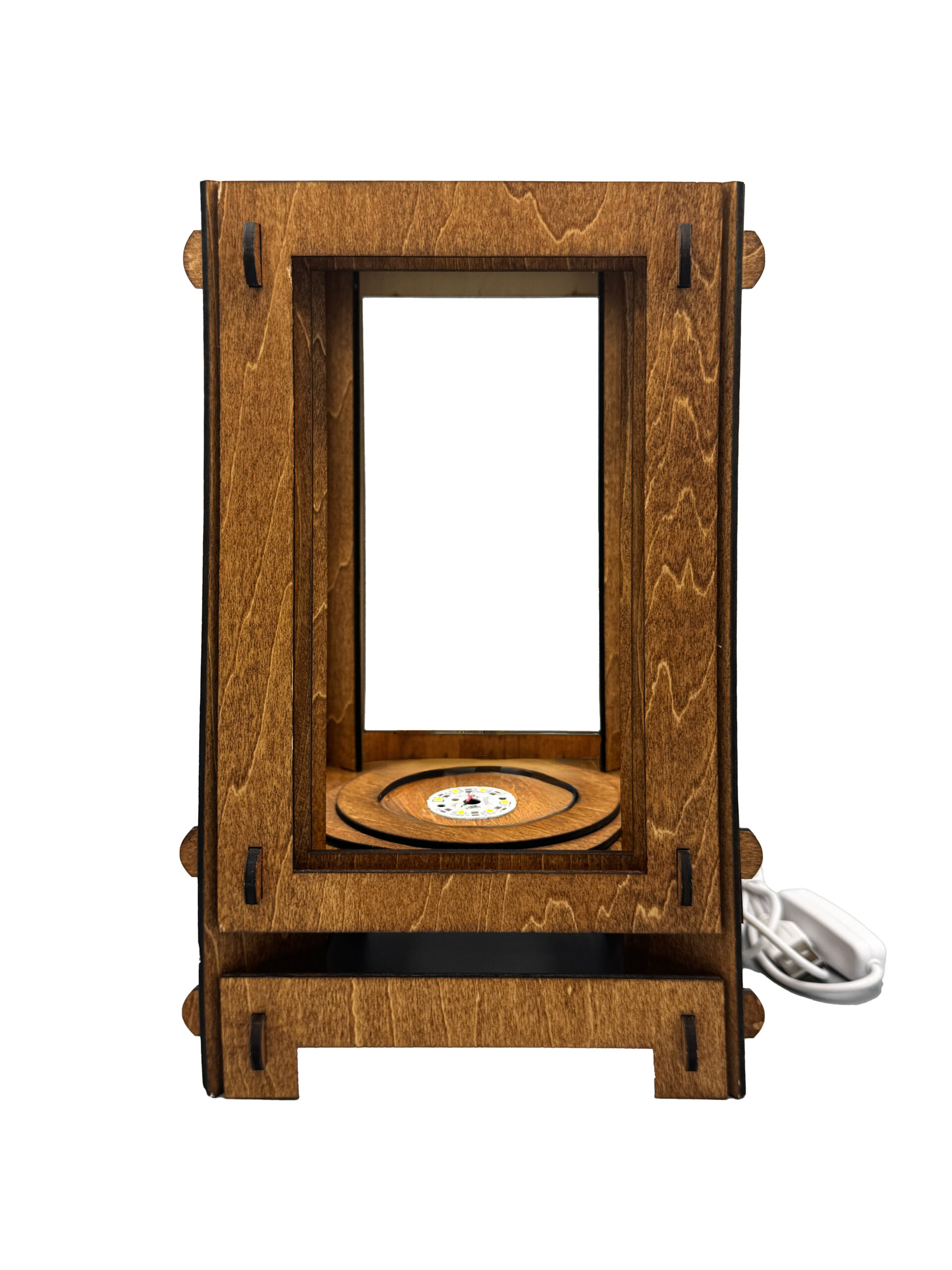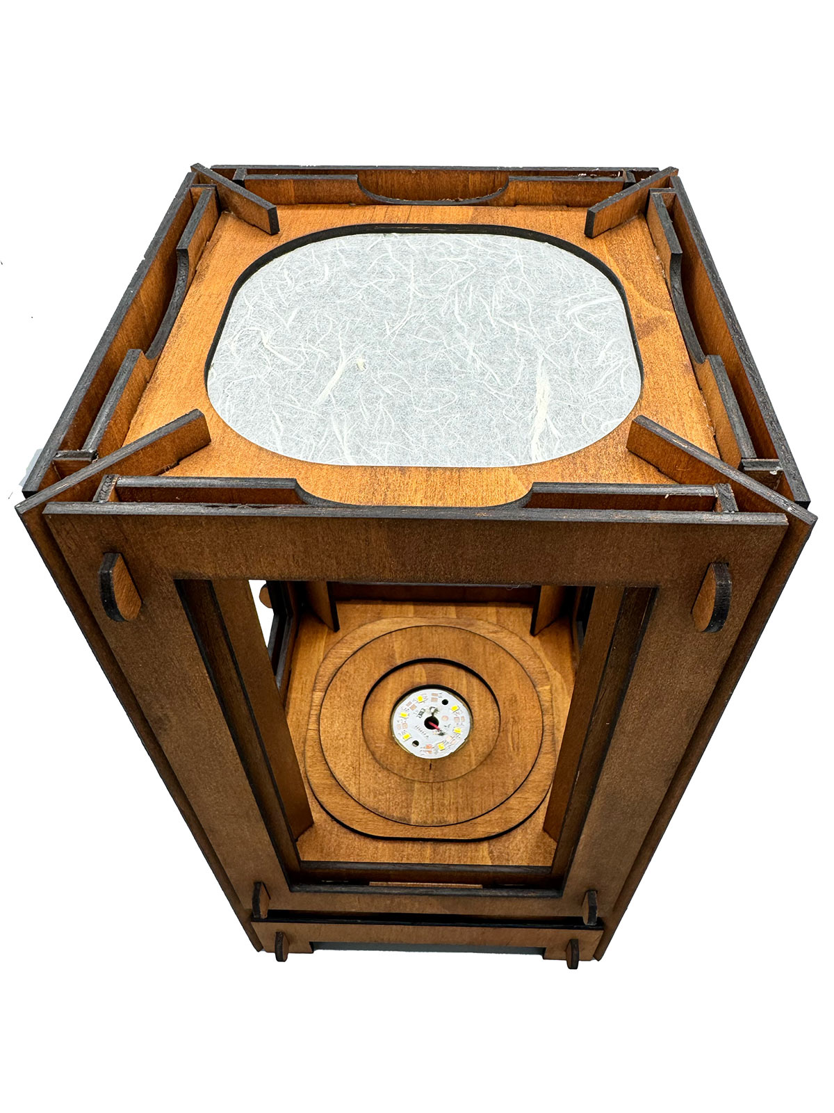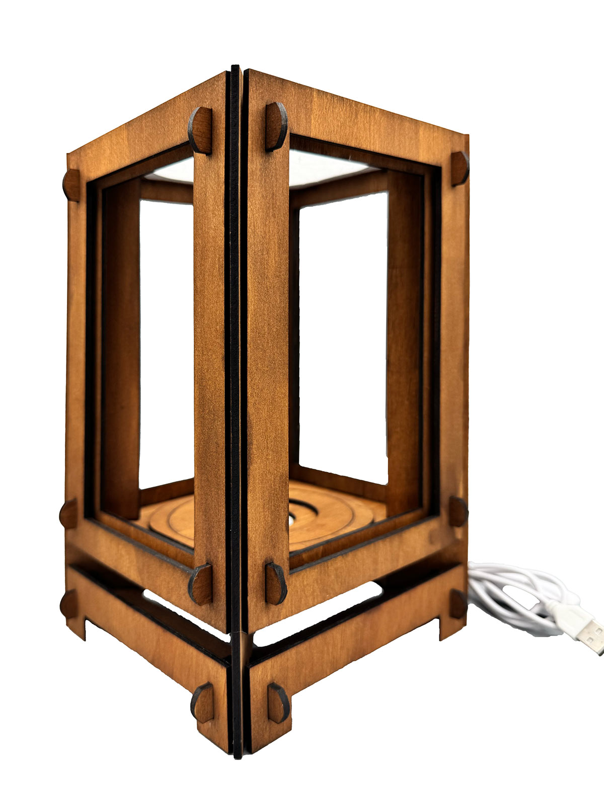 Handcrafted from 3mm plywood and stained with a rich walnut finish, each lamp is built with care and precision for durability and timeless style. The warm glow of a 240V LED USB-powered light is softly diffused through white rice paper, creating a gentle, ambient light that enhances any space. Measuring 25.5cm (H) × 16.5cm (W) × 16.5cm (D), it’s lightweight, compact, and striking in its simplicity.